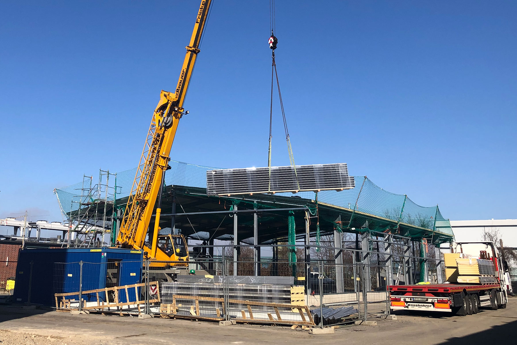 Beim Verwaltungs- und Sozialgebäude handelt es sich um ein Mehrzweckgebäude, das aus zwei Gebäudeteilen besteht. Während der erste Teil bereits im Frühjahr 2019 in Betrieb genommen wurde, dauerte die Errichtung des zweiten Teils noch bis in die zweite Jahreshälfte 2020. Ziel bei der Umsetzung der Baumaßnahme war ein reibungsloser und vor allem fortlaufender Betrieb ohne Unterbrechungen. Deshalb wurde ein Teil der alten Baracken zunächst erhalten, bis der erste Gebäudeteil bezugsfertig war. Nach dem Umzug konnten die Altgebäude zurückgebaut und die Abbruchmaterialien fachgerecht entsorgt werden. Danach folgte der zweite Gebäudeteil.